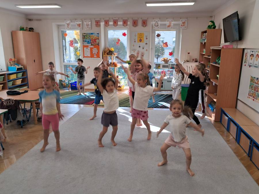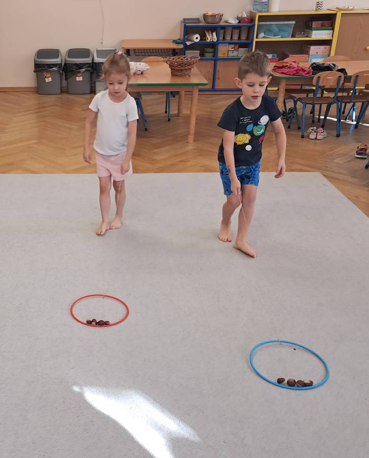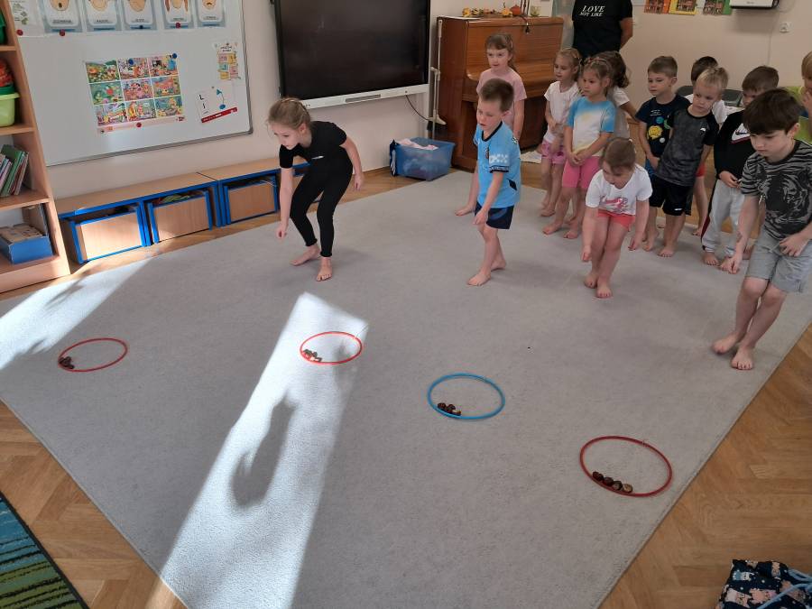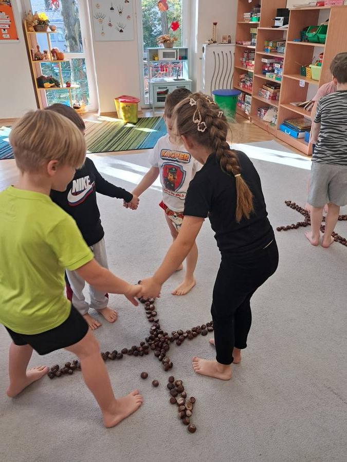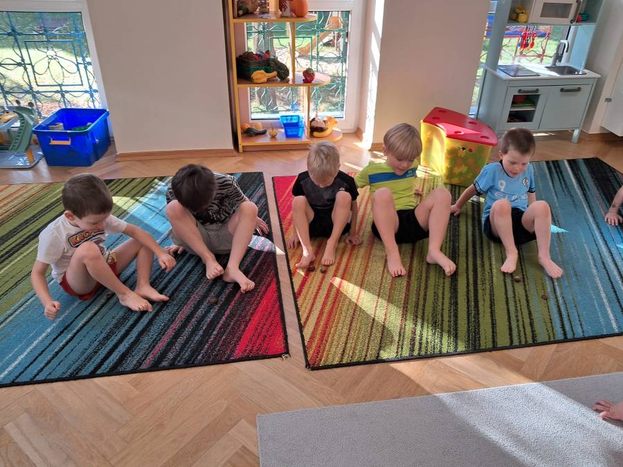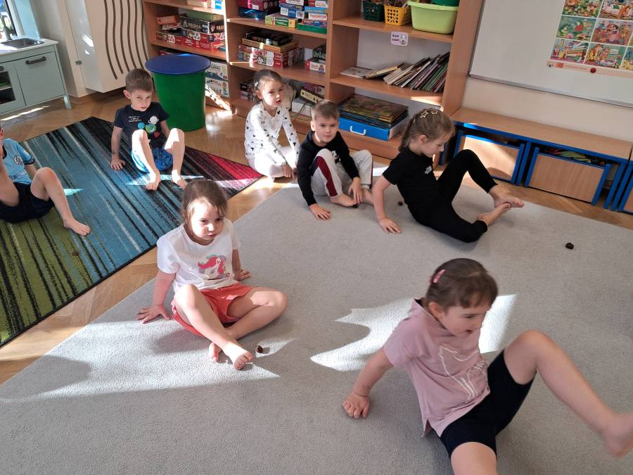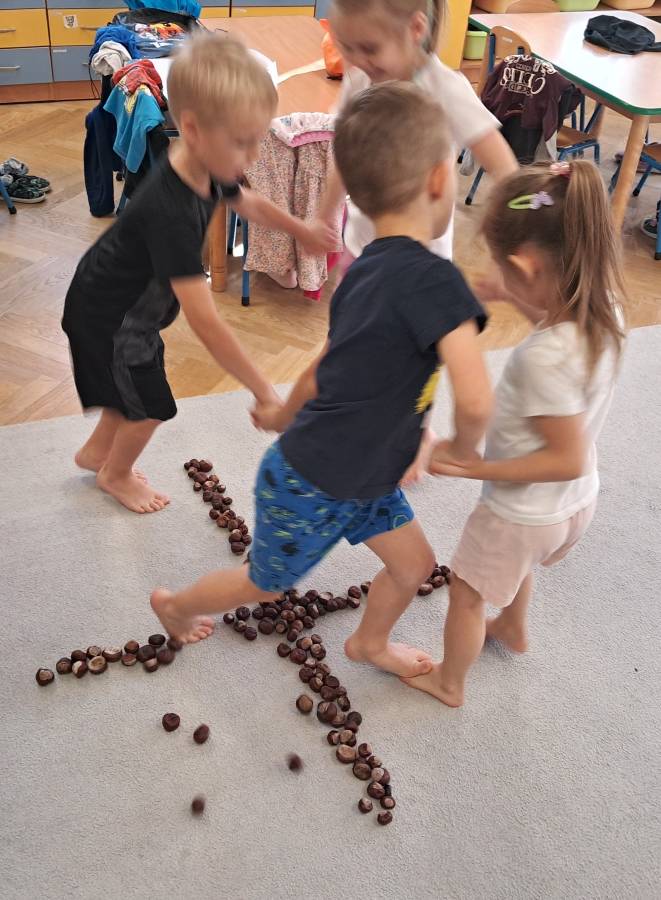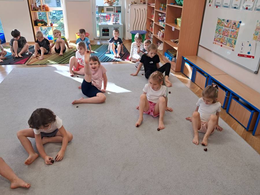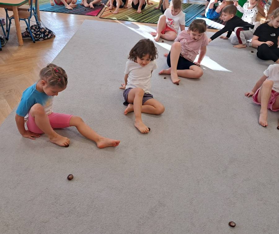 Żabki wykonały kolejne zadanie z projektu edukacyjnego pt. W zdrowym ciele zdrowy duch, wie to każdy mały zuch. Tym razem przedszkolaki wykonały ćwiczenia z kasztanami.