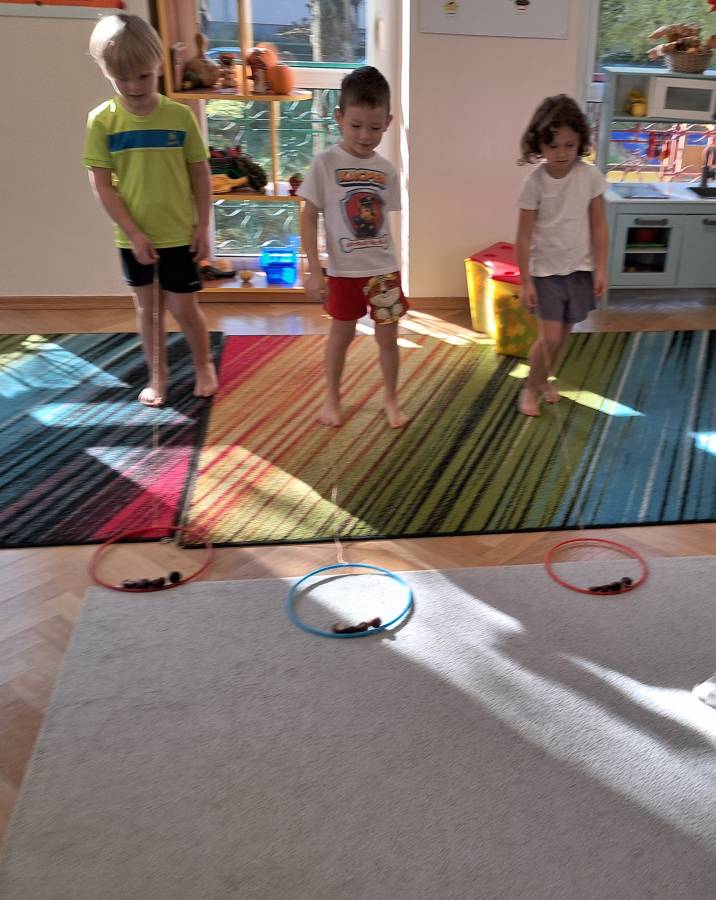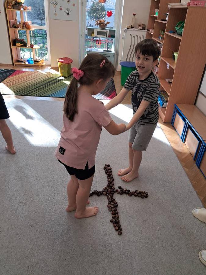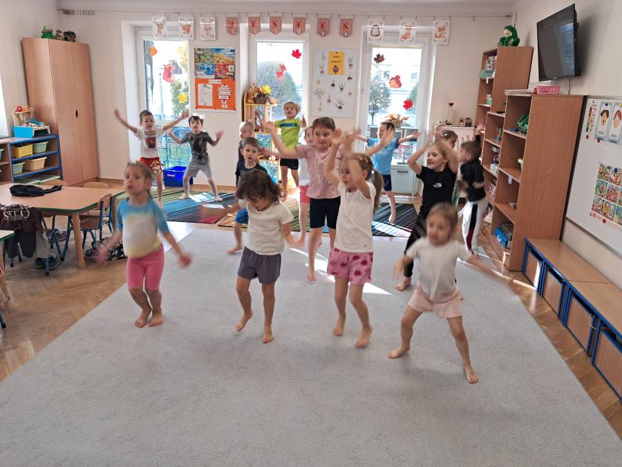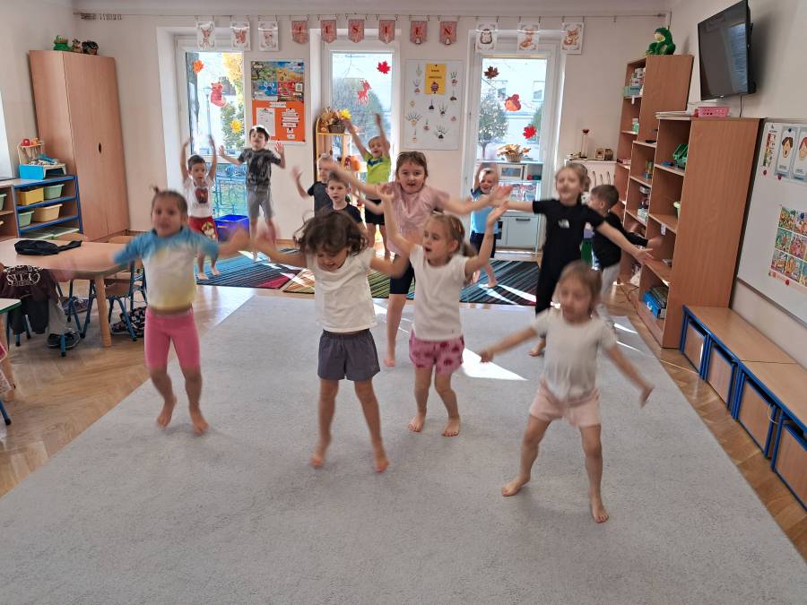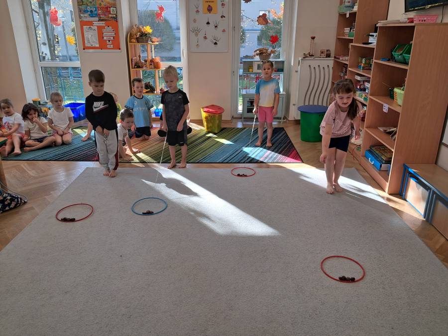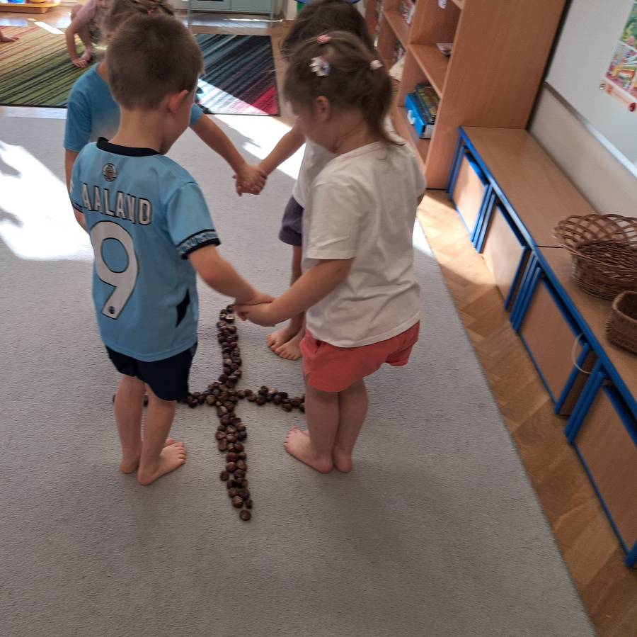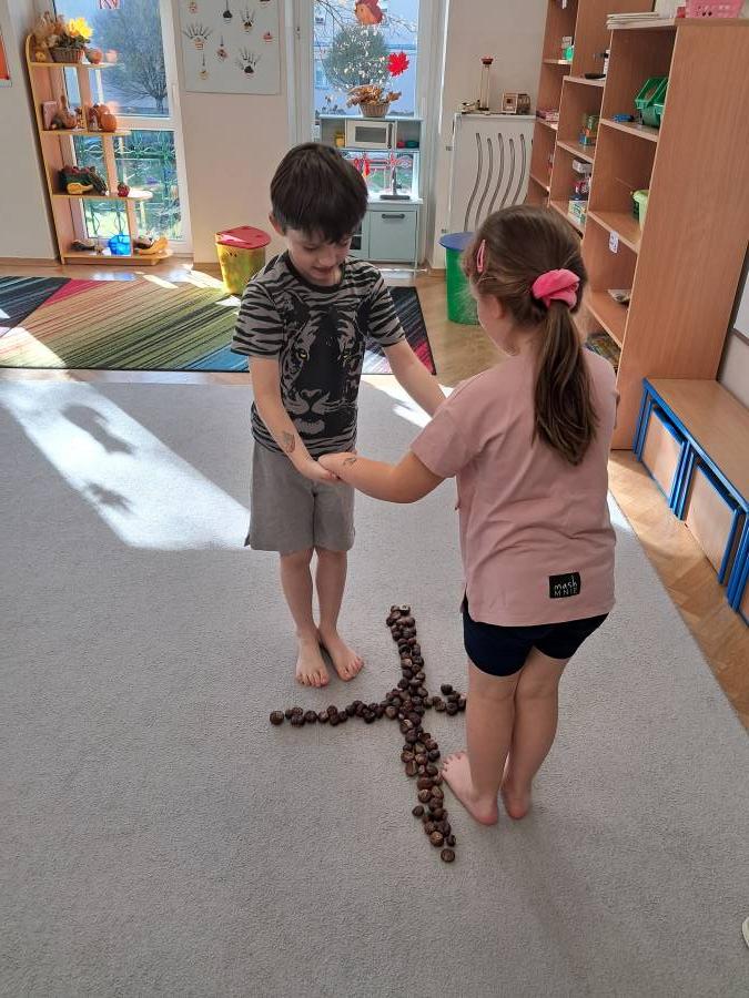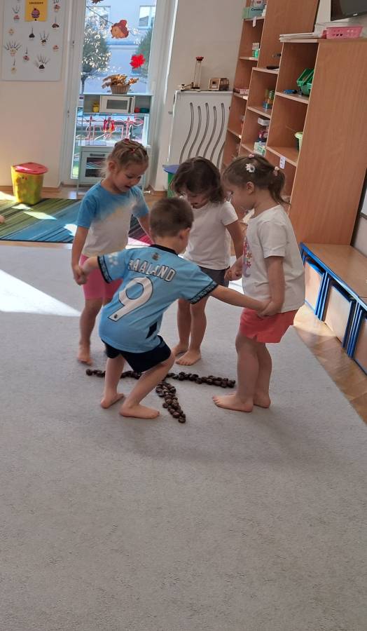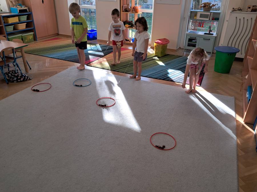 Żabki wykonały kolejne zadanie z projektu edukacyjnego pt. W zdrowym ciele zdrowy duch, wie to każdy mały zuch. Tym razem przedszkolaki wykonały ćwiczenia z kasztanami.