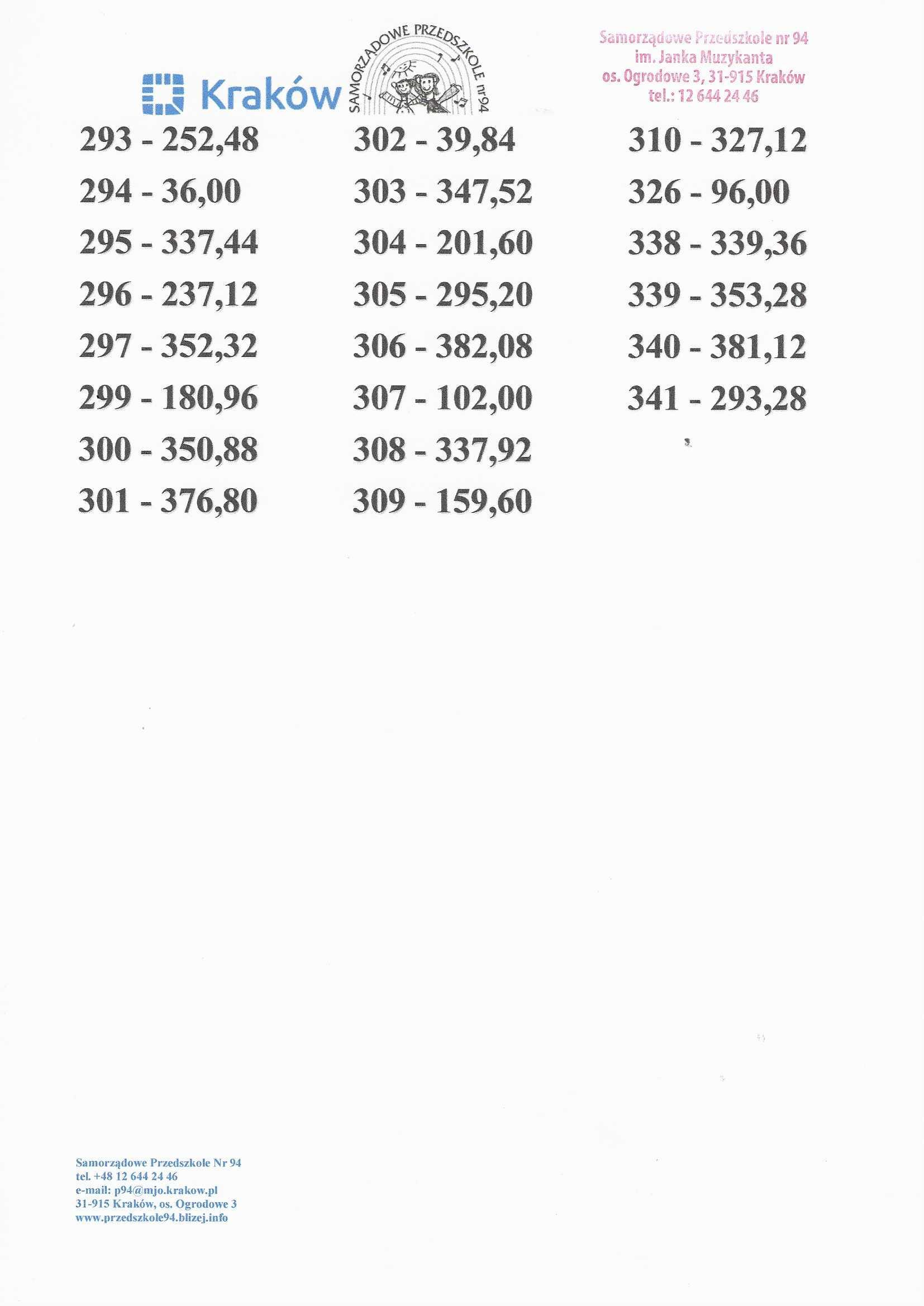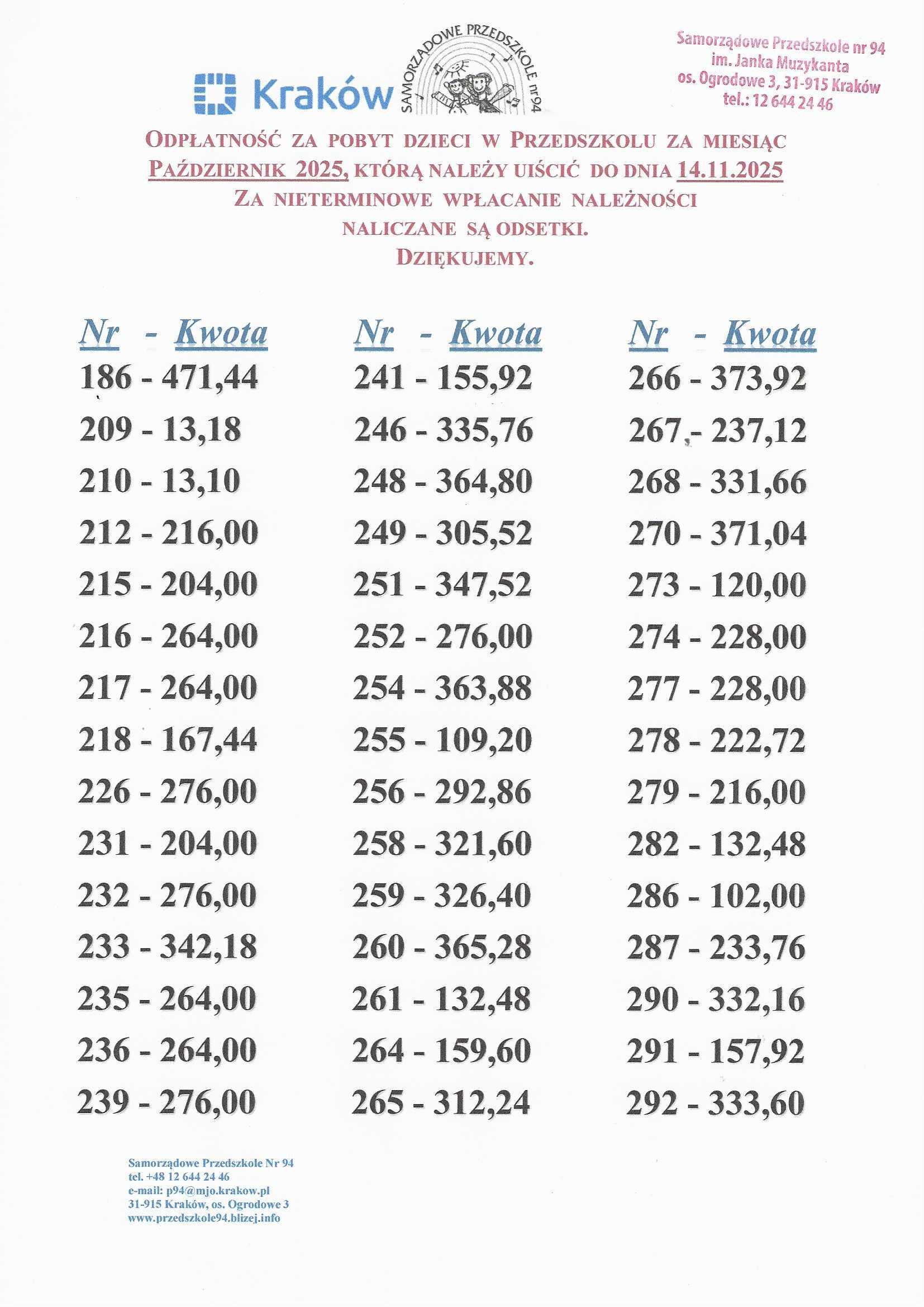 Na podstawie art. 52 ustawy z dnia 27 października 2017 r. o finansowaniu zadań oświatowych (Dz. U. 2017 r. poz. 2203 z późn. zm.), uchwały Nr XCVII/2509/18 Rady Miasta Krakowa z dnia 14 marca 2018 r. w sprawie określenia wysokości opłat za korzystanie z wychowania przedszkolnego uczniów objętych wychowaniem przedszkolnym w przedszkolach prowadzonych przez Gminę Miejską Kraków oraz zarządzenia Dyrektora Samorządowego Przedszkola nr 94 w Krakowie z dnia02-01-2019 informuję, iż opłata za korzystanie z wychowania przedszkolnego oraz opłata za korzystanie z wyżywienia od dnia uczęszczania dziecka do przedszkola będzie naliczana i uiszczana przez rodziców/opiekunów prawnych dziecka do dnia 14 każdego miesiąca następującego po miesiącu uczęszczania dziecka do przedszkola/oddziału przedszkolnego w szkołach podstawowych.