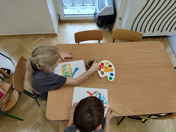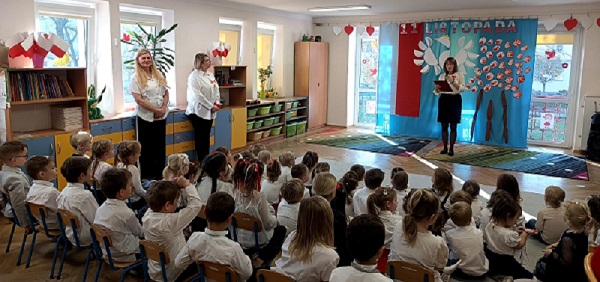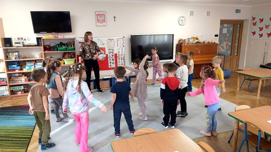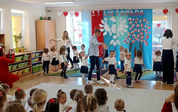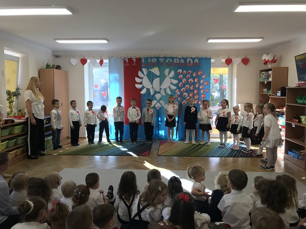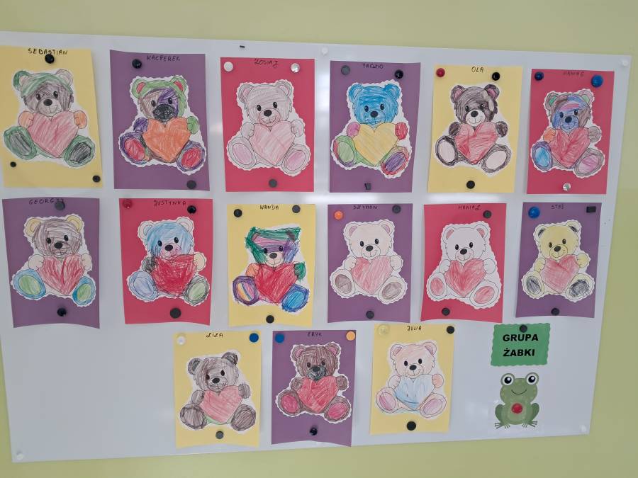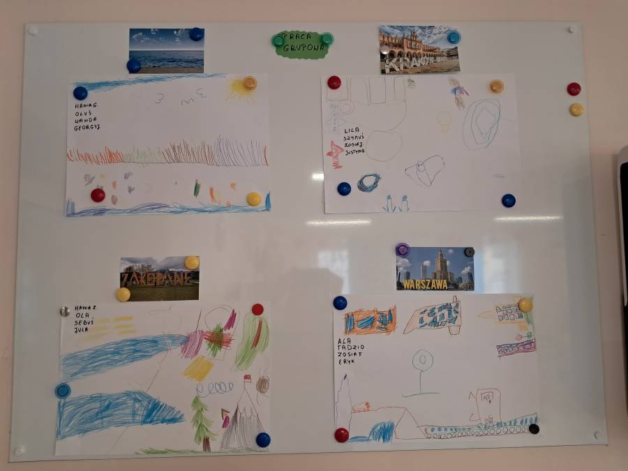 Żabki podczas zajęć dydaktycznych o Polsce zastanawiały się co to znaczy być Polakiem?. Wysłuchały recytacji wiersza pt. Polska oraz uczestniczyły w opowieści ruchowej pt. Skok przez Polskę. Podsumowaniem zajęć było zgadywanie zagadek o Polsce oraz wykonanie pracy grupowej, której celem było narysowanie symboli danego miejsca w Polsce- Kraków, Warszawa, Zakopane i morze Bałtyckie.