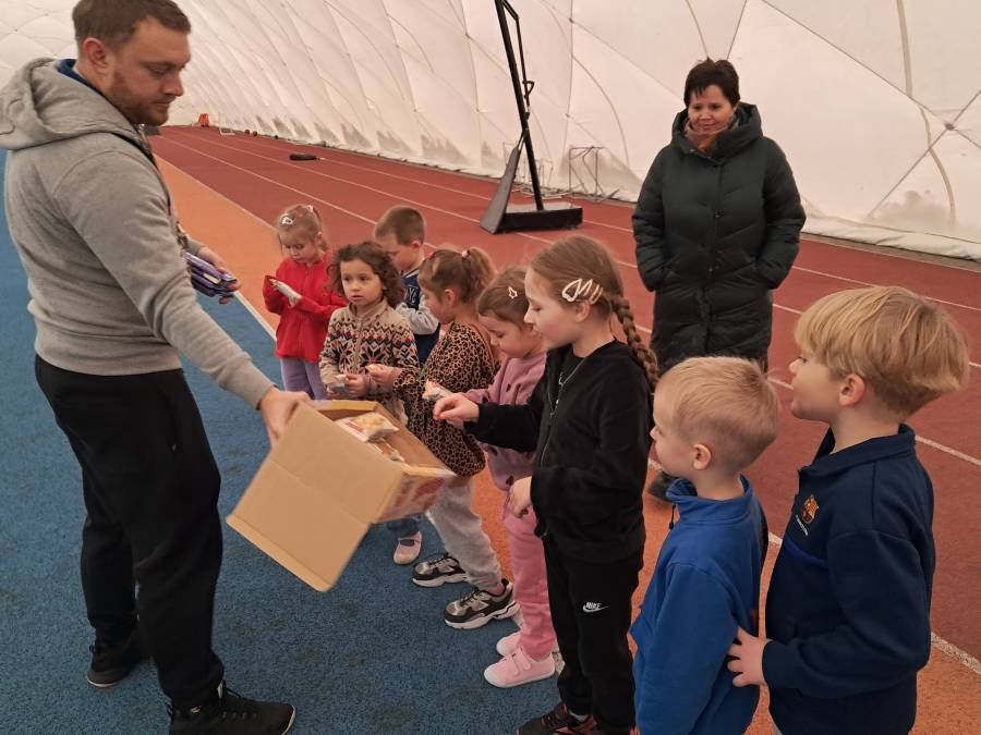 Grupa 4 w hali sportowej SP nr 37 podczas zawodów sportowych Aktywny Przedszkolak