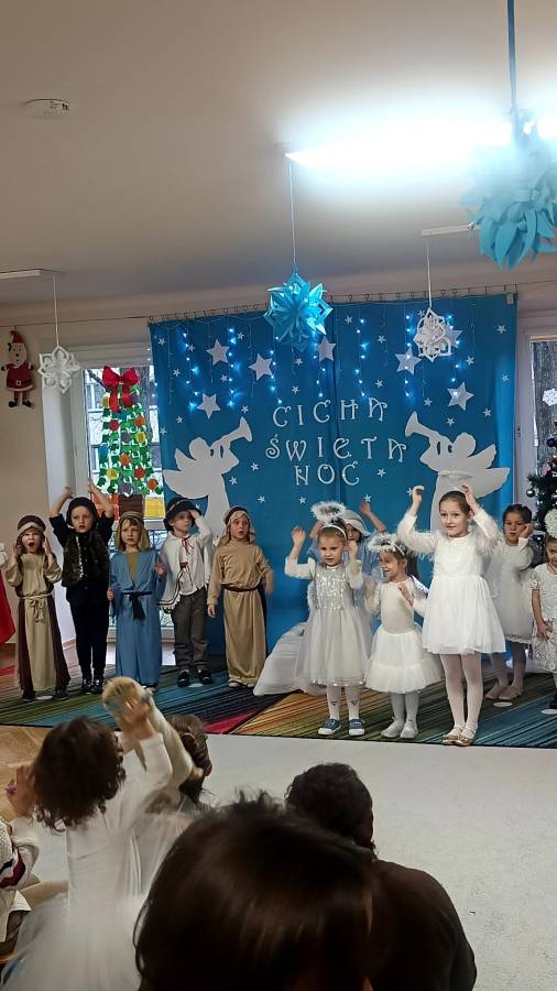 Święta Bożego Narodzenia to wyjątkowy i magiczny czas, pełen radości i rodzinnych spotkań. O tę świąteczną atmosferę zadbała grupa Żabki, która w piątek, 12 grudnia, zaprezentowała przygotowywane od kilku tygodni Jasełka bożonarodzeniowe. Podczas występu przedszkolaki przedstawiły swoją opowieść o narodzinach Jezusa, oprawioną kolędami, pastorałką itp. Scenografia oraz stroje przedszkolaków były idealnym dopełnieniem całego przedstawienia. Mali artyści z dużym przejęciem i zaangażowaniem wiernie odtwarzali swoje role, prezentowali umiejętności recytatorskie, taneczne i wokalne. Za swój występ otrzymali gromkie brawa od rodziców. Zwieńczeniem występu było wręczenie rodzicom przygotowanych własnoręcznie przez dzieci prezentu świątecznego.