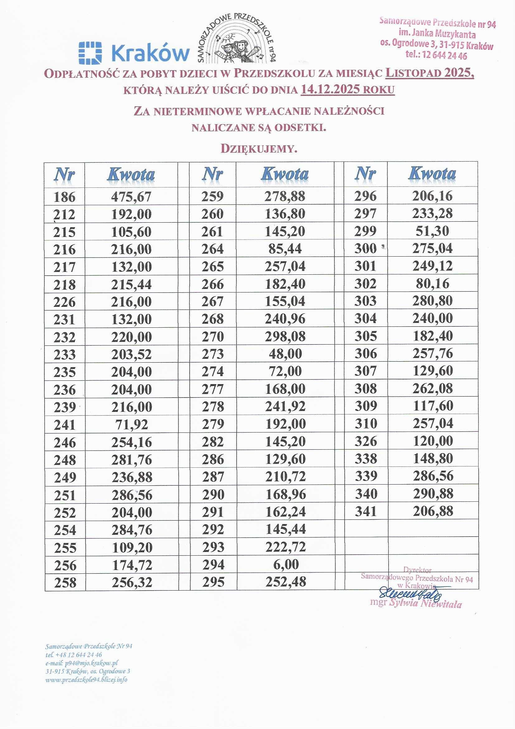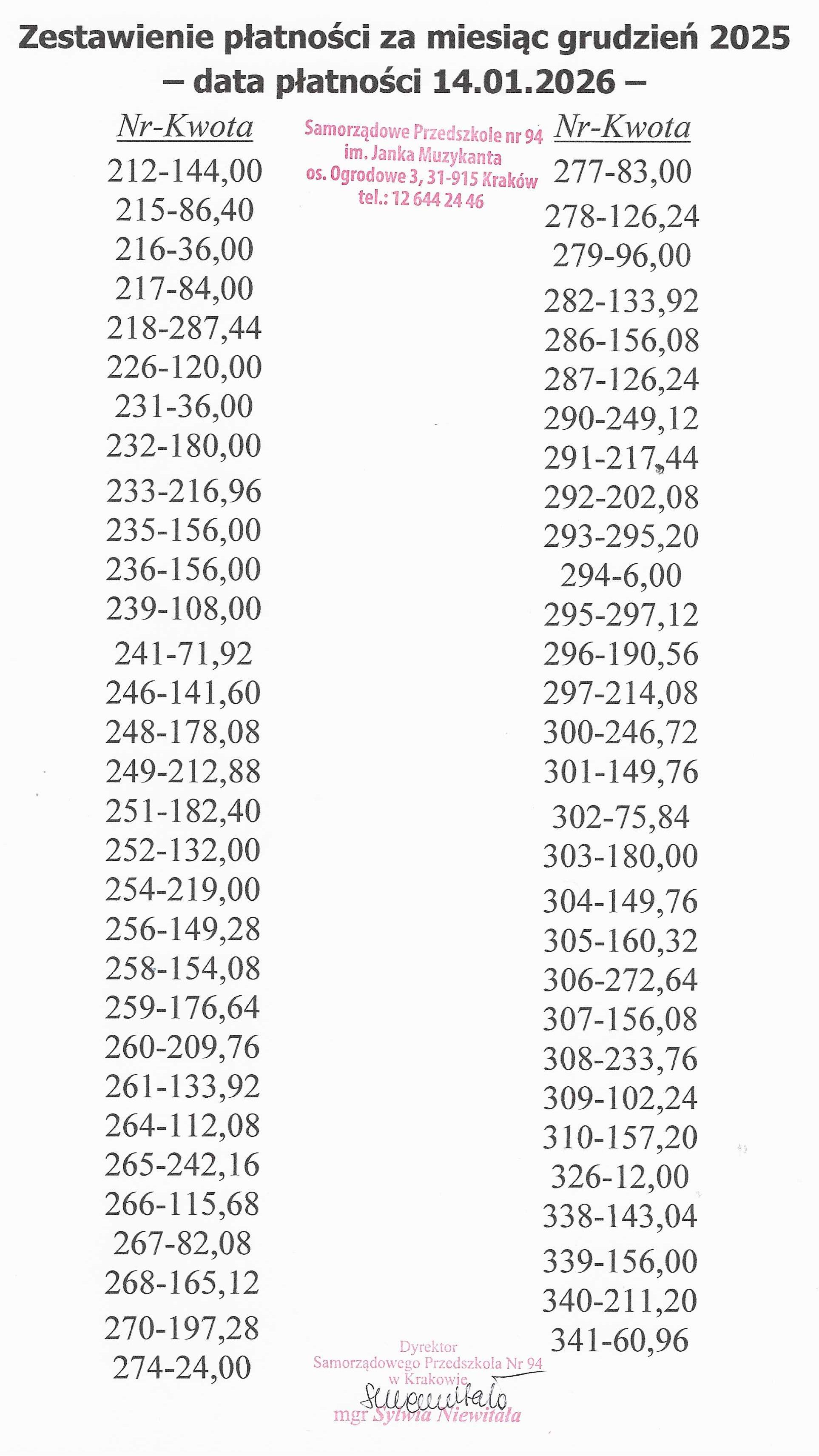 Po otrzymaniu niniejszej informacji rodzice/opiekunowie prawni dziecka są zobowiązani dokonać do dnia 14 tego miesiąca zapłaty we wskazanej wysokości na rachunek bankowy. Kwota należna do zapłaty powinna być zgodna z informacją otrzymaną od dyrektora.
