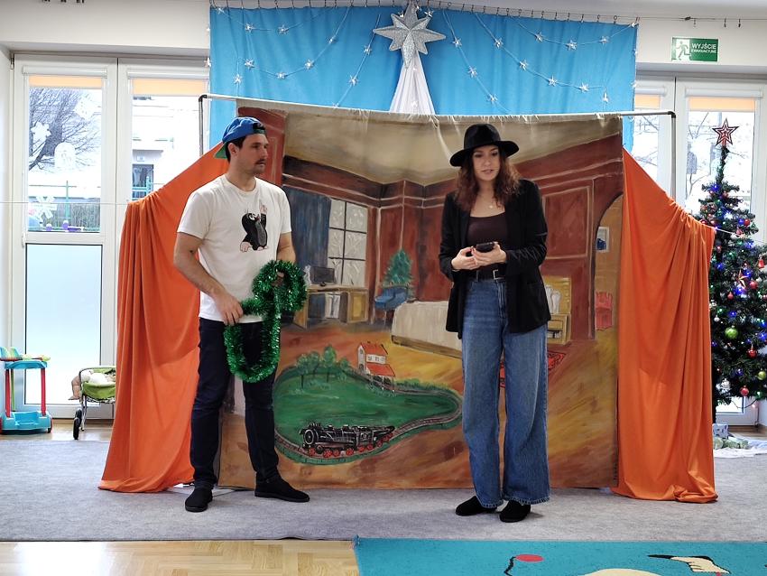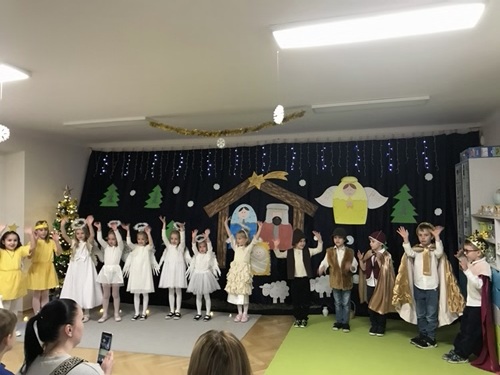 Święta Bożego Narodzenia to wyjątkowy i magiczny czas, pełen radości i rodzinnych spotkań. O tę świąteczną atmosferę zadbała grupa Żabki, która w piątek, 12 grudnia, zaprezentowała przygotowywane od kilku tygodni Jasełka bożonarodzeniowe.  Podczas występu przedszkolaki przedstawiły swoją opowieść o narodzinach Jezusa, oprawioną kolędami, pastorałką itp. Scenografia oraz stroje przedszkolaków były idealnym dopełnieniem całego przedstawienia. Mali artyści z dużym przejęciem i zaangażowaniem wiernie odtwarzali swoje role, prezentowali umiejętności recytatorskie, taneczne i wokalne. Za swój występ otrzymali gromkie brawa od rodziców. Zwieńczeniem występu było wręczenie rodzicom przygotowanych własnoręcznie przez dzieci prezentu świątecznego.