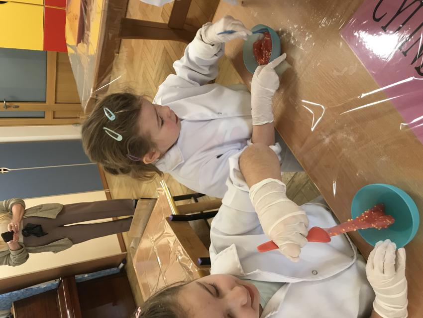 Starszaki ćwiczą motorykę małą i sprawność manualną podczas pracy plastycznej.
